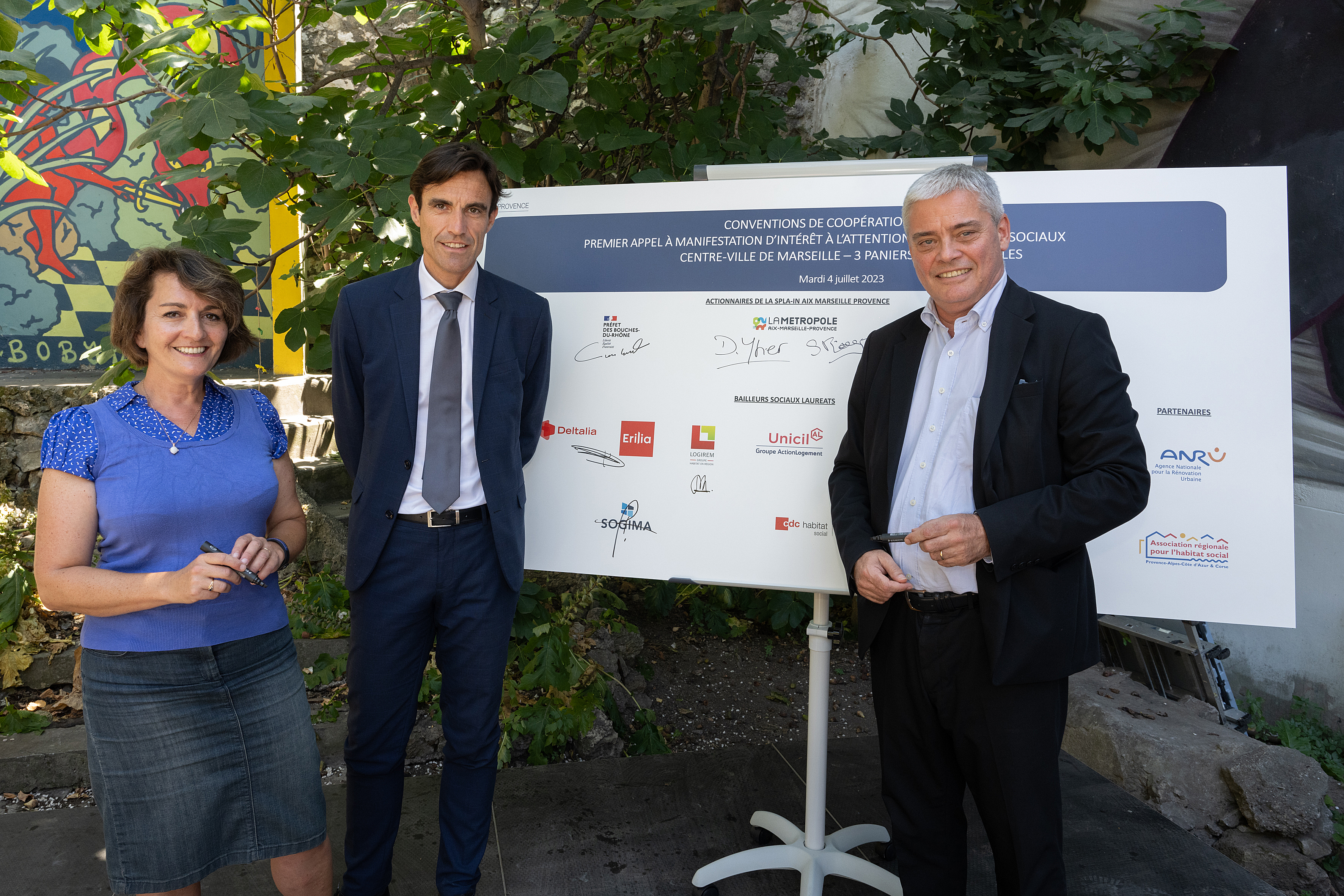 organisée par les 3 actionnaires (l’État, Métropole Aix-Marseille-Provence, Ville de Marseille) de la SPLA-IN Aix-Marseille-Provence en présence de Laurent Carrié, Préfet délégué à l'égalité des chances, chargé du plan Marseille en Grand, David Ytier, Président de la SPLA-IN AMP, de Patrick Amico, Adjoint au Maire de Marseille en charge de la politique du logement et de la lutte contre l'habitat indigne, de Sophie CAMARD, Maire des 1er et 7e arrondissements de Marseille, de Franck Caro, Directeur Général de la SPLA-IN AMP, de Frédéric LAVERGNE, Directeur Général d'Erilia, Fabienne Abecassis, Directrice Générale de LOGIREM, Pierre-Edouard BERGER, Président du Directoire de SOGIMA, représentants du Groupement ERILIA-LOGIREM-SOGIMA.